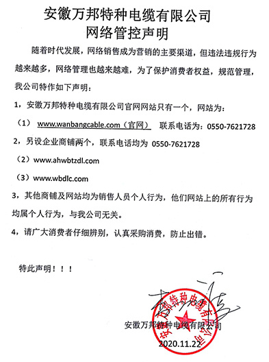 鄭重聲明:安徽萬邦特種電纜有限公司官方網站為:www_wanbangcable_com.ducuwtb.cn,除此之外無任何子網站或合作網站,其余均為假冒偽劣。電話:0550-7621728 13485756353 地 址:安徽省天長市滁州高新技術產業開發區經四路29號